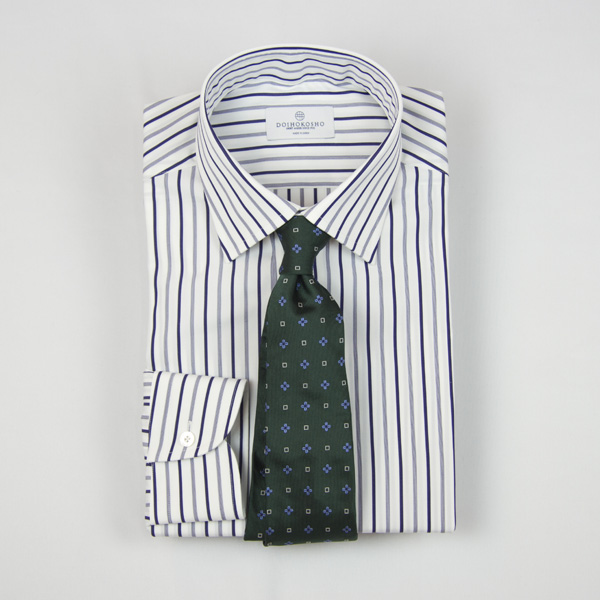 ネイビーベースのストライプはネクタイとも相性が良く、セミワイドカラーを合わせることで、ビジネスにもドレスシーンにも映える一枚に仕上げています。