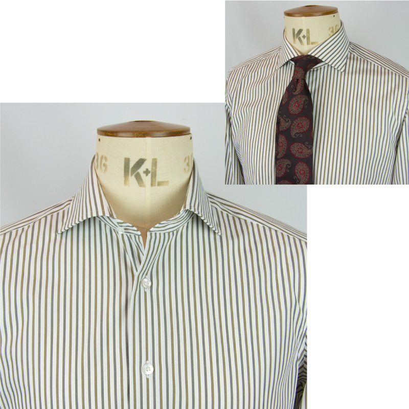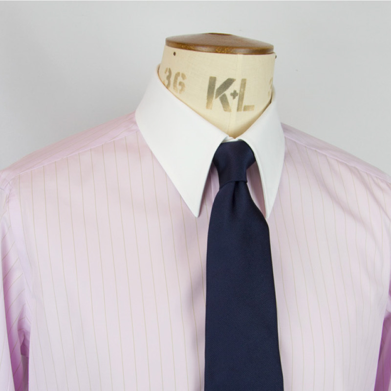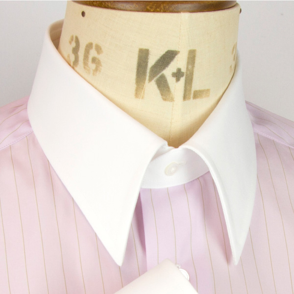 クラシックなレギュラーカラーをベースに、襟羽の開きをやや絞った現代的なバランス。